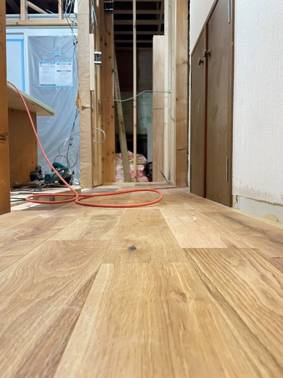 本日はナラ無垢材の床張り工事中。