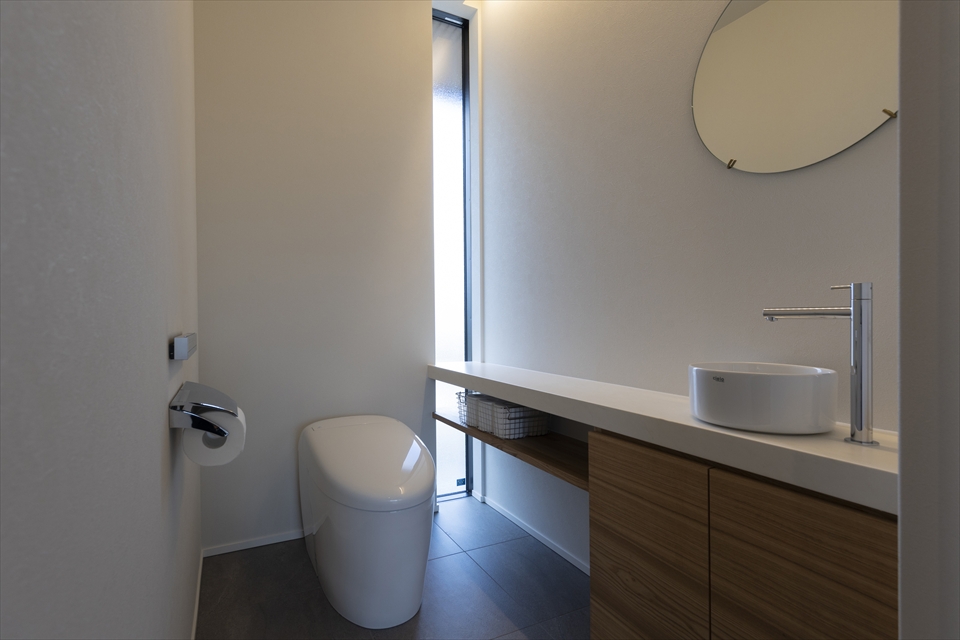明るい光が差し込むトイレ空間。こだわりの造作手洗いカウンターも気持ちよく使用できる。