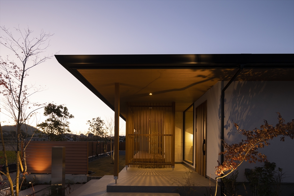 大きく伸びた軒と零れる灯りが印象的な、落ち着いた和モダンのお家。