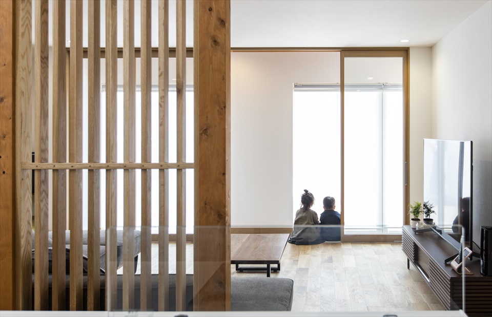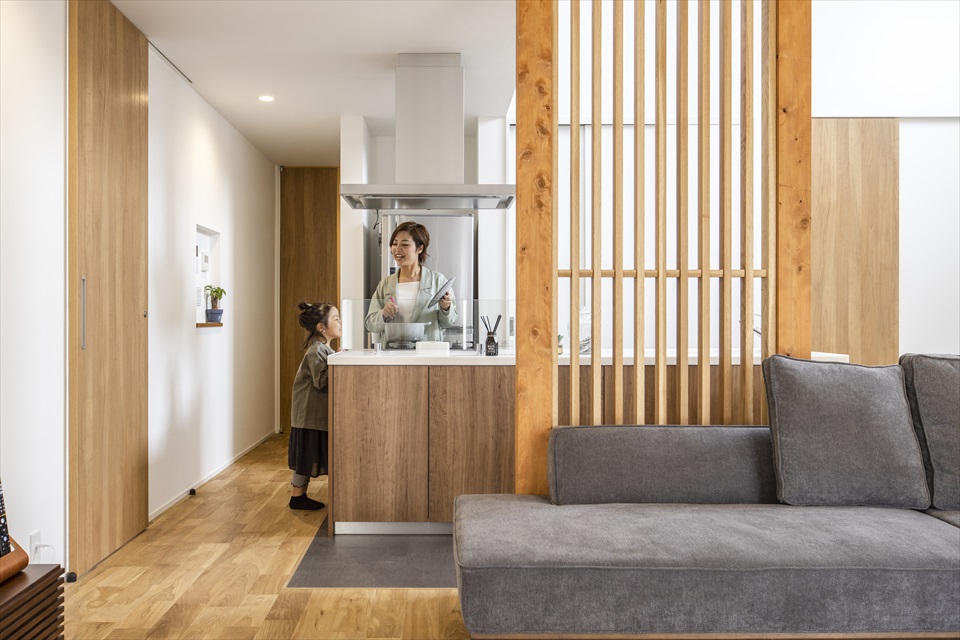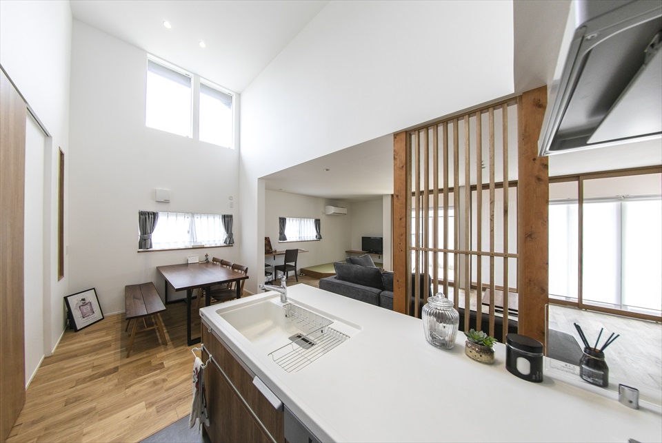 【格子とキッチン】キッチンからフロア全体を見渡せアイランドキッチン。まわりに家族が集まりコミュニケーションがとれ、キッチンに立つ時間も快適に。構造上必要な柱は格子にして、程よく目線を遮りながらも風の通りを感じる事ができます。