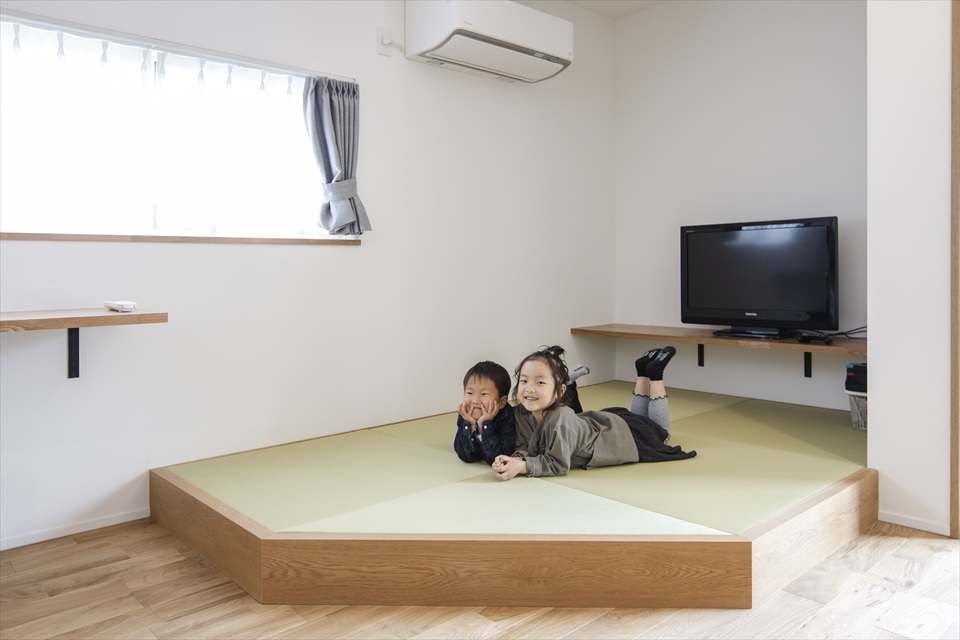 【畳コーナー】リビングに畳の空間がほしかった、というご主人の要望に応えて小上がりの畳エリアを。ごろんと寝転んだり、ゲームをしたり大活躍。