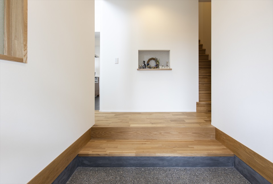 【玄関】繊細かつ美しさ溢れる洗い出しの玄関が、訪問者を出迎えてくれます。無垢材が目を惹く和モダンのリノベーション住宅。