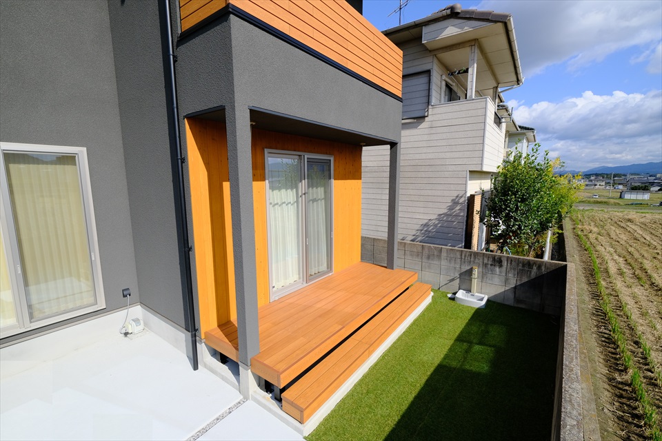 【縁側デッキ】目の前に広がる田園風景を眺めながら、ちょっと腰を掛けてのんびり過ごせる縁側デッキ。