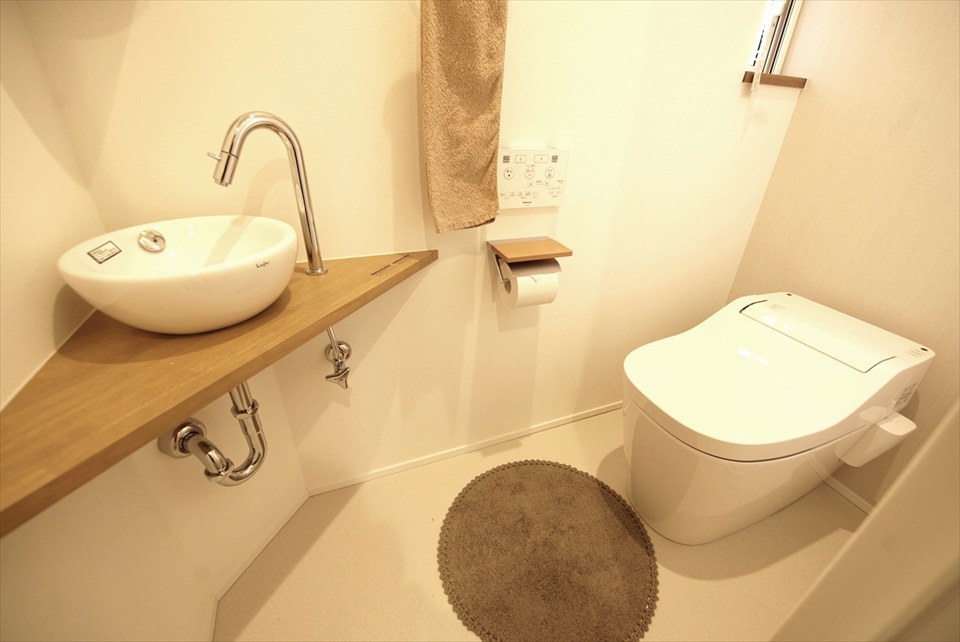 【トイレ】デッドスペースになりがちな階段下を有効活用した設計。造作の手洗いカウンターは、シンプルなデザインで落ち着いた空間です。