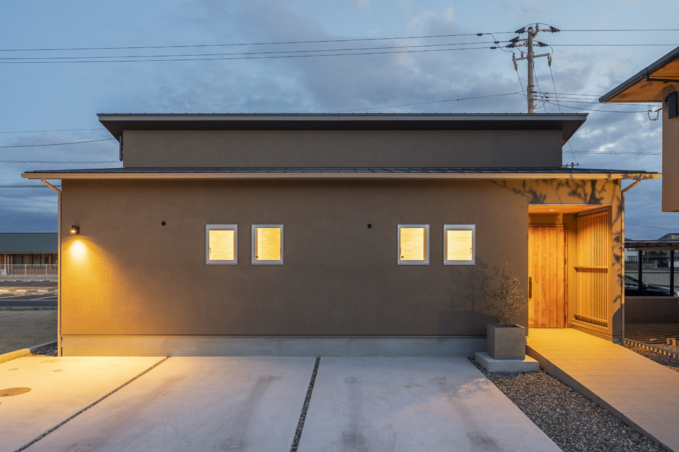 重厚感のある和モダンの平屋の家。室内からこぼれる光が優しく灯り、幻想的な外観。