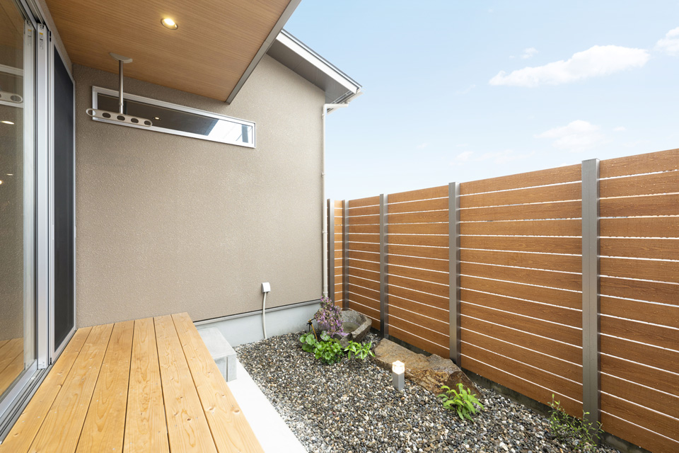 【ウッドデッキ】リビングから繋がるウッドデッキは、外からの視線を気にすることなく家族と過ごせます。