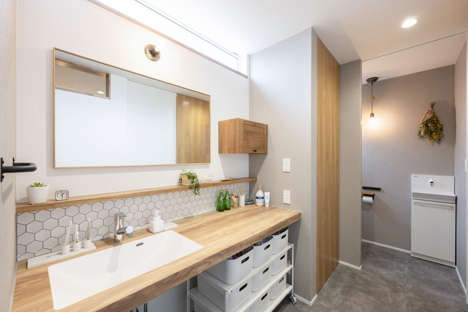 【洗面脱衣室・トイレ】水廻りは1か所にまとめて家事効率をアップ。朝の忙しい時間も混雑することなくゆったりとした設計です。