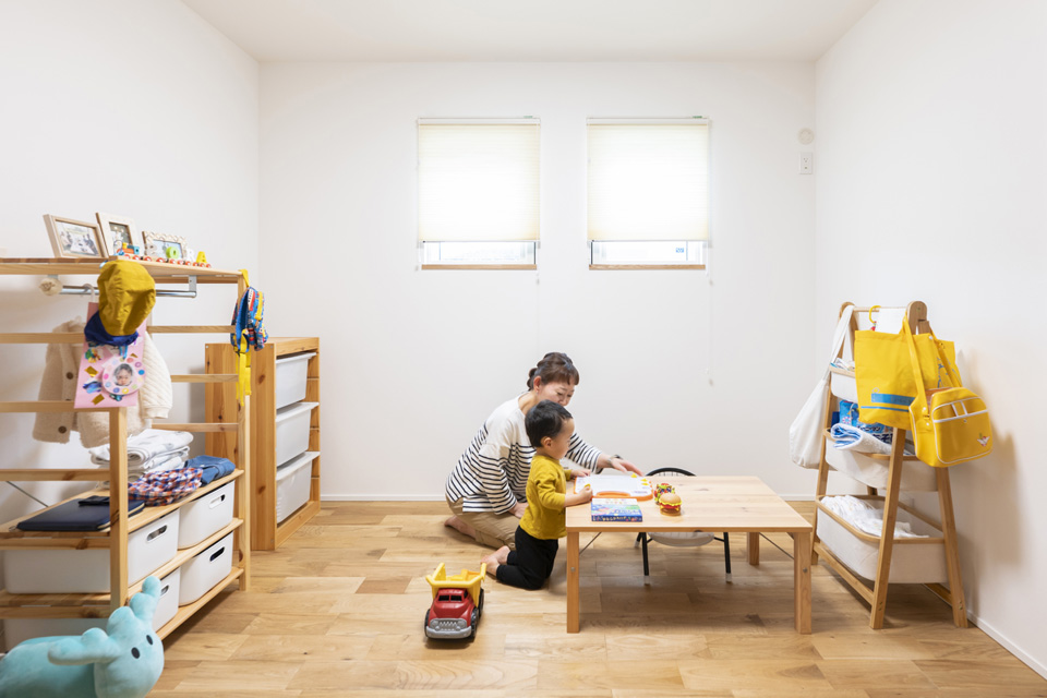 【子ども部屋】無垢の床は、裸足で過ごす子供も心地よく遊べます。シンプルな内装に無垢の温かさを感じられるのデザインです。