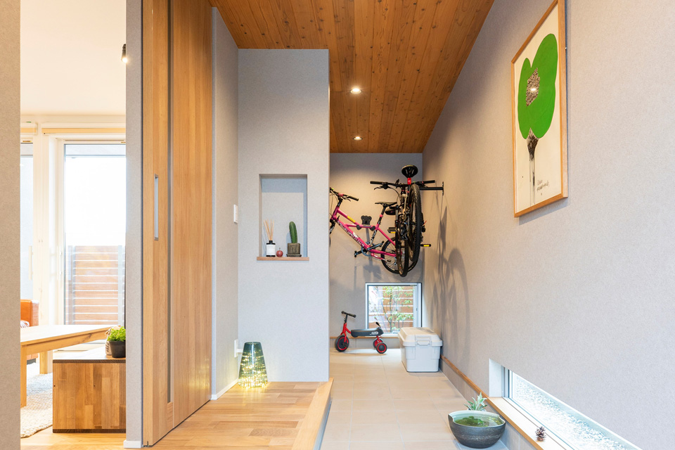 【玄関土間】玄関扉を開けるとまっすぐにのびる土間の先には、景色を切りとるピクチャーウィンドウ。その先のシンボルツリーが優しく迎えてくれるお住まい。