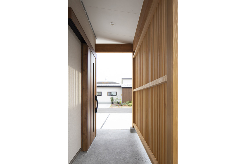 杉の格子が視線を遮りながら、心地よい風を取り入れられる玄関