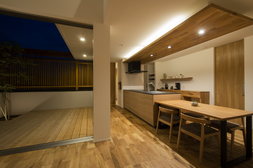 【キッチン】作る人と食べる人の距離を縮める、横並びのキッチンとダイニング。下がり天井の間接照明が上質な空間を演出。