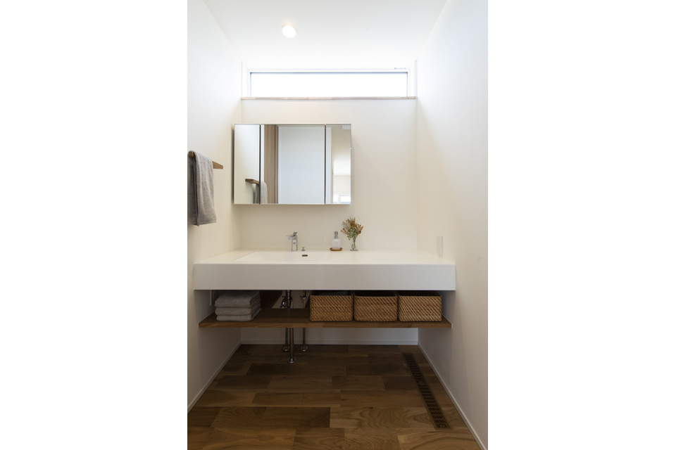 【洗面】洗面室と脱衣室を別に設ける事で家族のプライバシーを守りつつ、お客様も気兼ねなく使える造作洗面。