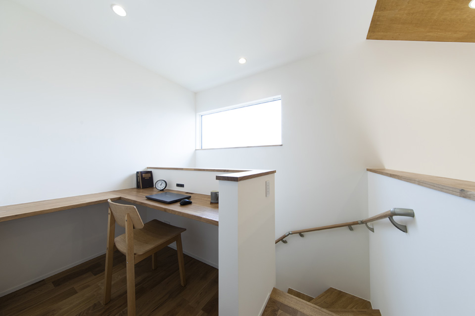 【ワークスペース】適度なお籠り感でパソコン作業が捗る、ワークスペース。隣は吹き抜けになっているので、1階にいる家族と会話を愉しめる距離感。