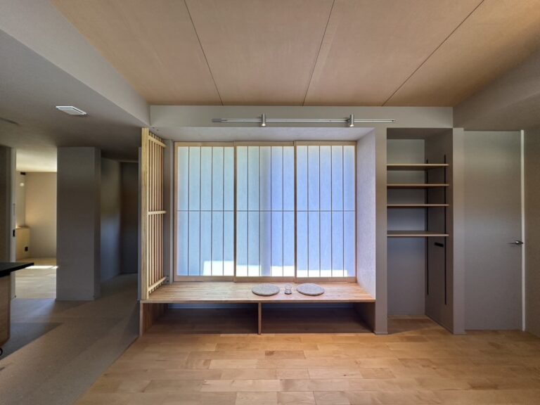 こんにちは。イノセンス建築設計事務所の田中です。 新築のお家が、ついに完成しました。 リビングには、木製格子をあしらった造作ベンチを設けています。障子越しのやわ…