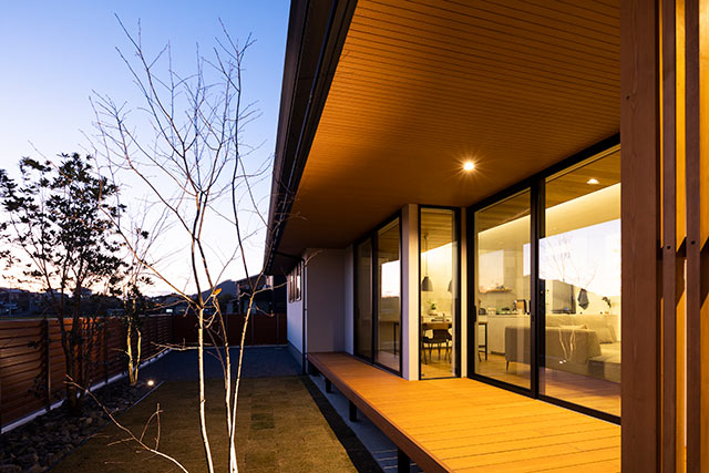 家の中を、間仕切りでぶつ切りにするのではなく、緩やかにつながりながら、一緒にいるのに、それぞれが「在る」というように。大きく開き外を取り込む大開口のサッシ、そこからプライベートテラス、デッキに広がって行き、景色を取り込む。その間を途切れることなく、緩やかにつながり、暮らせるように。