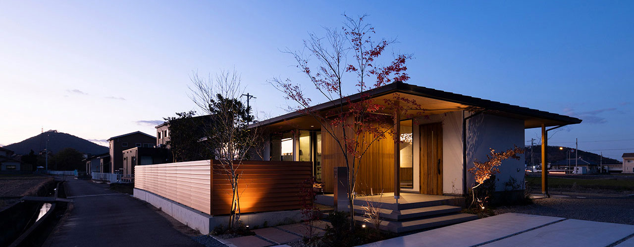 街並みに馴染み、植栽や街の緑に溶け込む和モダンデザイン住宅。シンプルに深くかかる2枚の屋根は、流行り廃りとは無縁などこか懐かしい日本家屋を。中庭にあるシンボルツリーは、四季の移ろいを内に導きます。決して目立つ家ではないが、何故か佇まいが美しい。そんなデザイン表現してます。
