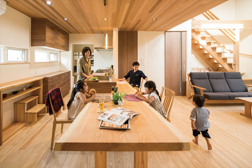 キッチンを中心に回遊性を持たせ、水廻りや居室の動線を簡潔にし、ご家族が心地よく過ごせる設計に。