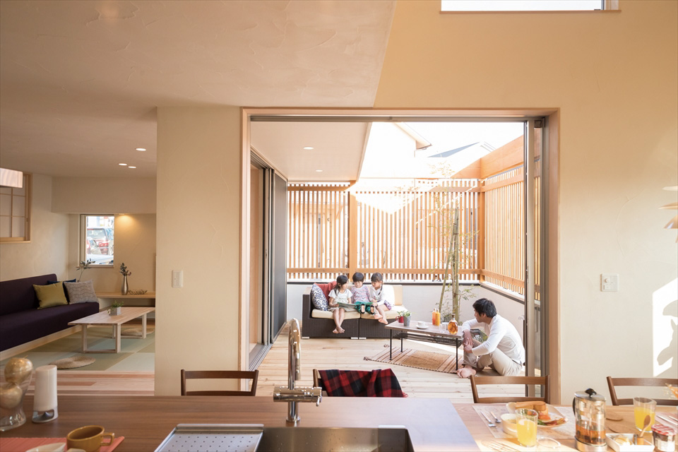 大開口サッシから続く中庭デッキは、格子から気持ちのいい風が通り抜け、くつろぎの時間を愉しむゆったりとした空間。